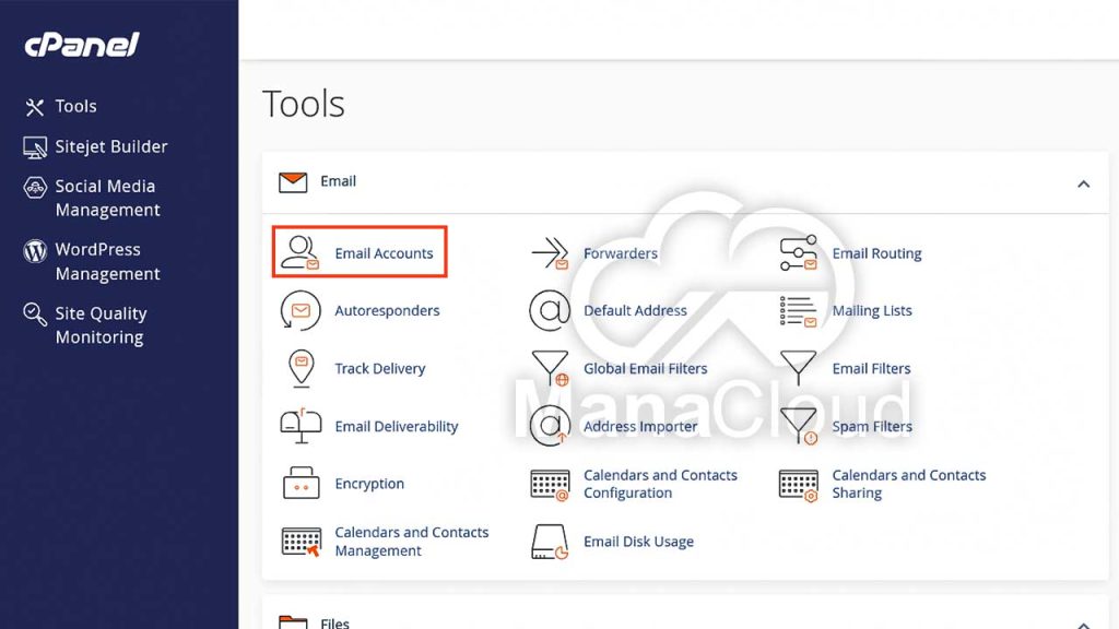 پس از ورود به سی پنل، از بخش Email گزینه Email Accounts را انتخاب کنید. این بخش مرکز اصلی مدیریت ایمیل‌های دامنه شماست و تمام عملیات ساخت، ویرایش و حذف ایمیل از همین قسمت انجام می‌شود.