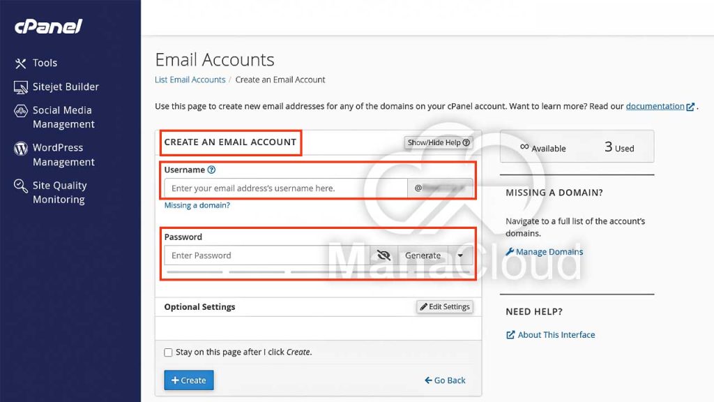 سپس از بخش Create an Email Account، نام ایمیل موردنظر را در قسمت Username وارد کنید. این نام به‌عنوان بخش ابتدایی آدرس ایمیل و قبل از علامت ‎@‎ قرار می‌گیرد.