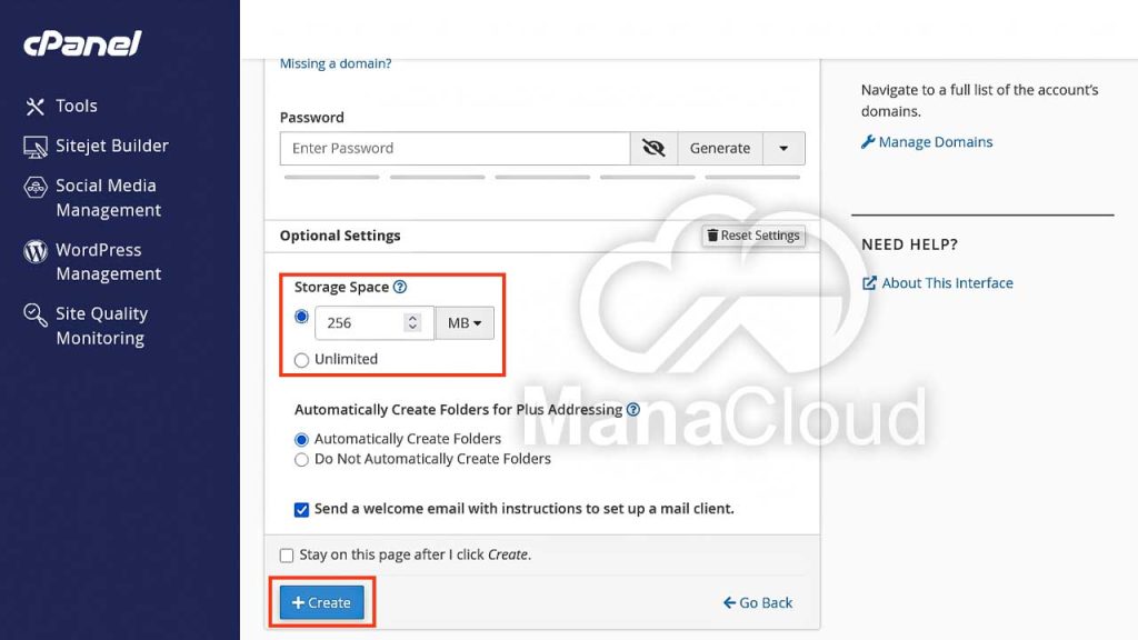 در مرحله بعد با انتخاب Edit Settings از بخش Optional Settings با تنظیم بخش Storage Space می‌توانید میزان فضای ایمیل را مشخص نمایید. می‌توانید فضای نامحدود یا محدود بر اساس نیاز انتخاب کنید. پس از تکمیل اطلاعات، روی گزینه Create کلیک کنید تا ایمیل ساخته شود.