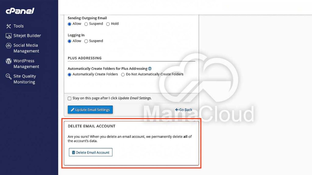 در صورتی که به ایمیلی نیاز ندارید، می‌توانید به‌راحتی آن را از بخش Delete Email Account حذف کنید. توجه داشته باشید که با حذف ایمیل، تمام پیام‌های موجود نیز پاک خواهند شد و امکان بازگشت وجود ندارد.