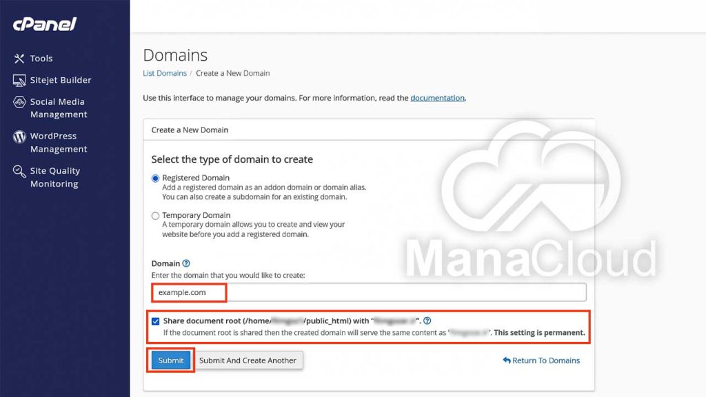example.com) را در بخش Domain وارد نمایید. - گزینه Share document root را فعال کنید تا دامنه بهصورت پارک شده اضافه شود.